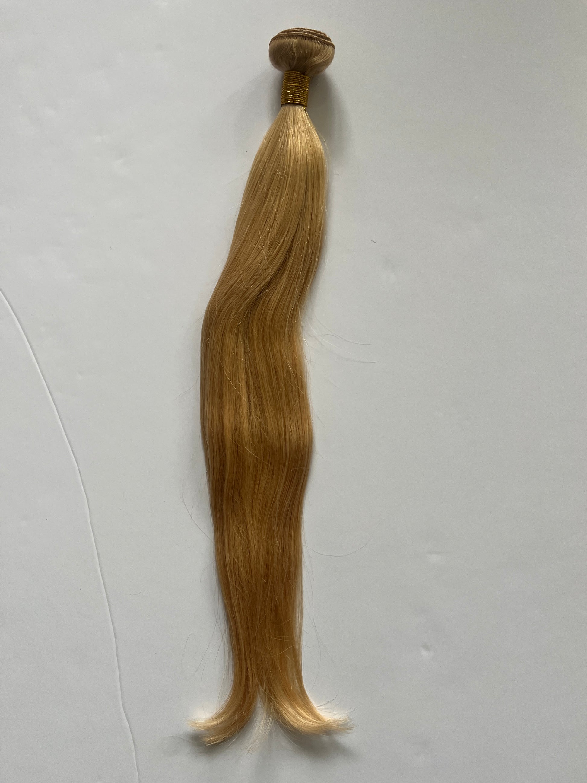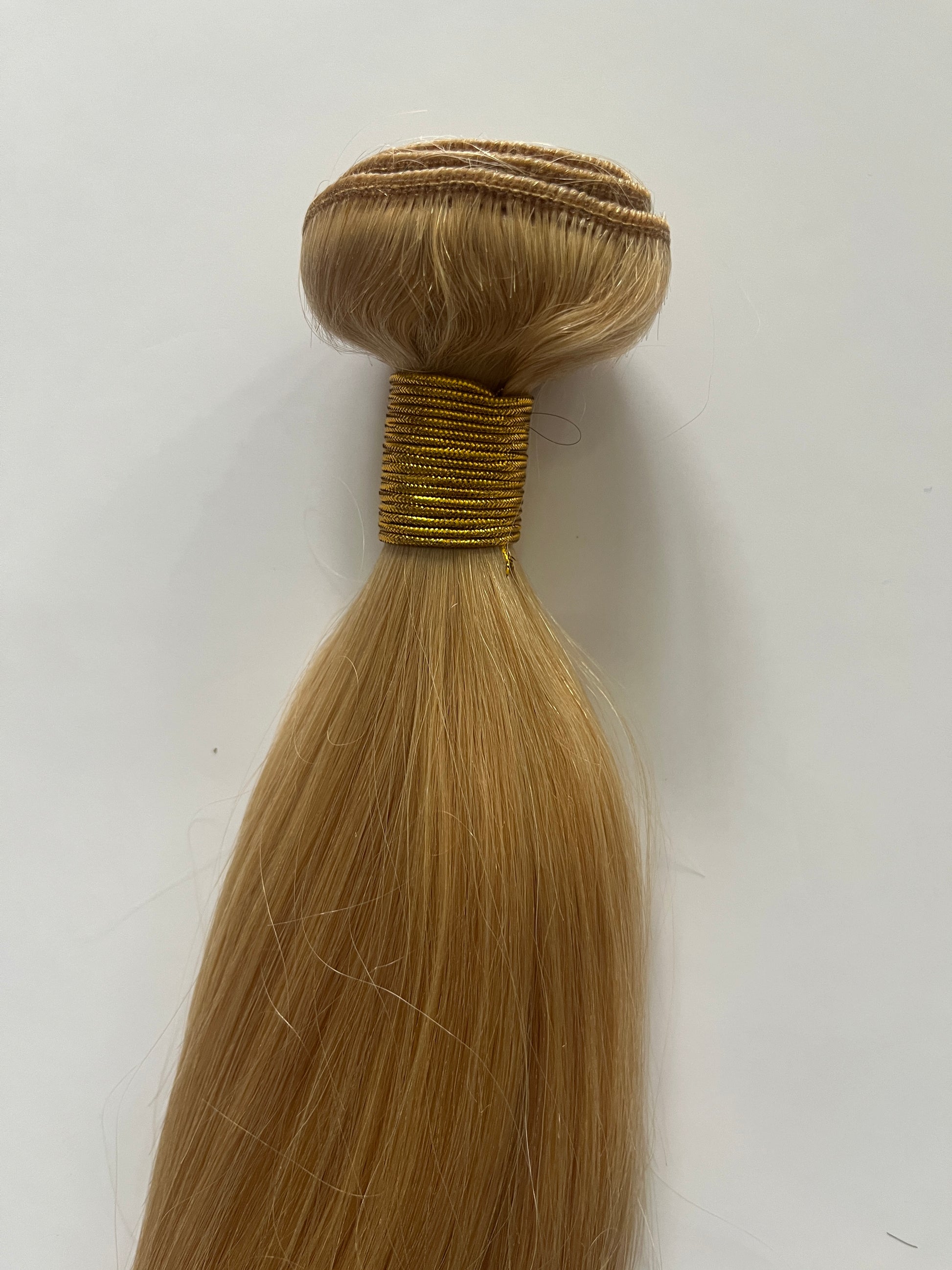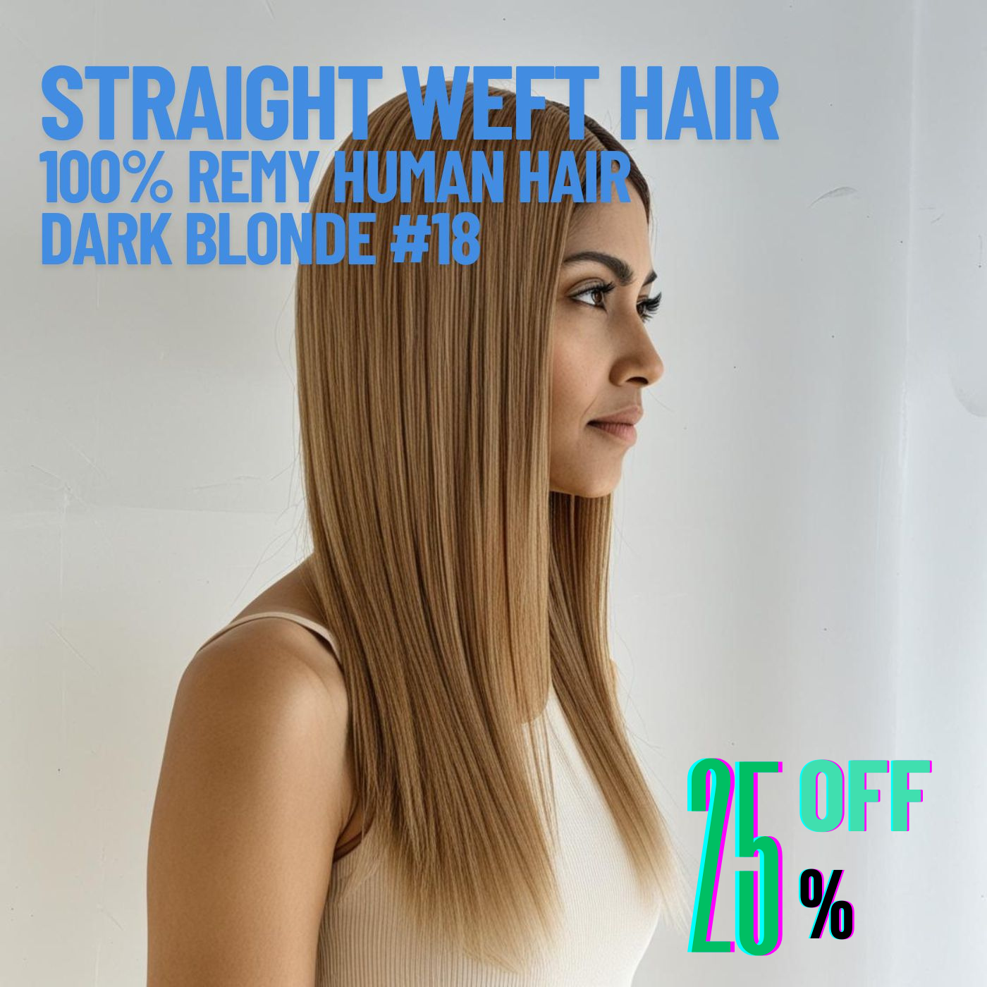 Dark Blonde #18 Weft Hair Extensions – 100% Remy Human Hair, soft, sleek, and versatile. Our #18 Straight Weft extensions are perfect for sew-in or DIY clip-in styles, blending naturally with your own hair for a fuller, longer look.