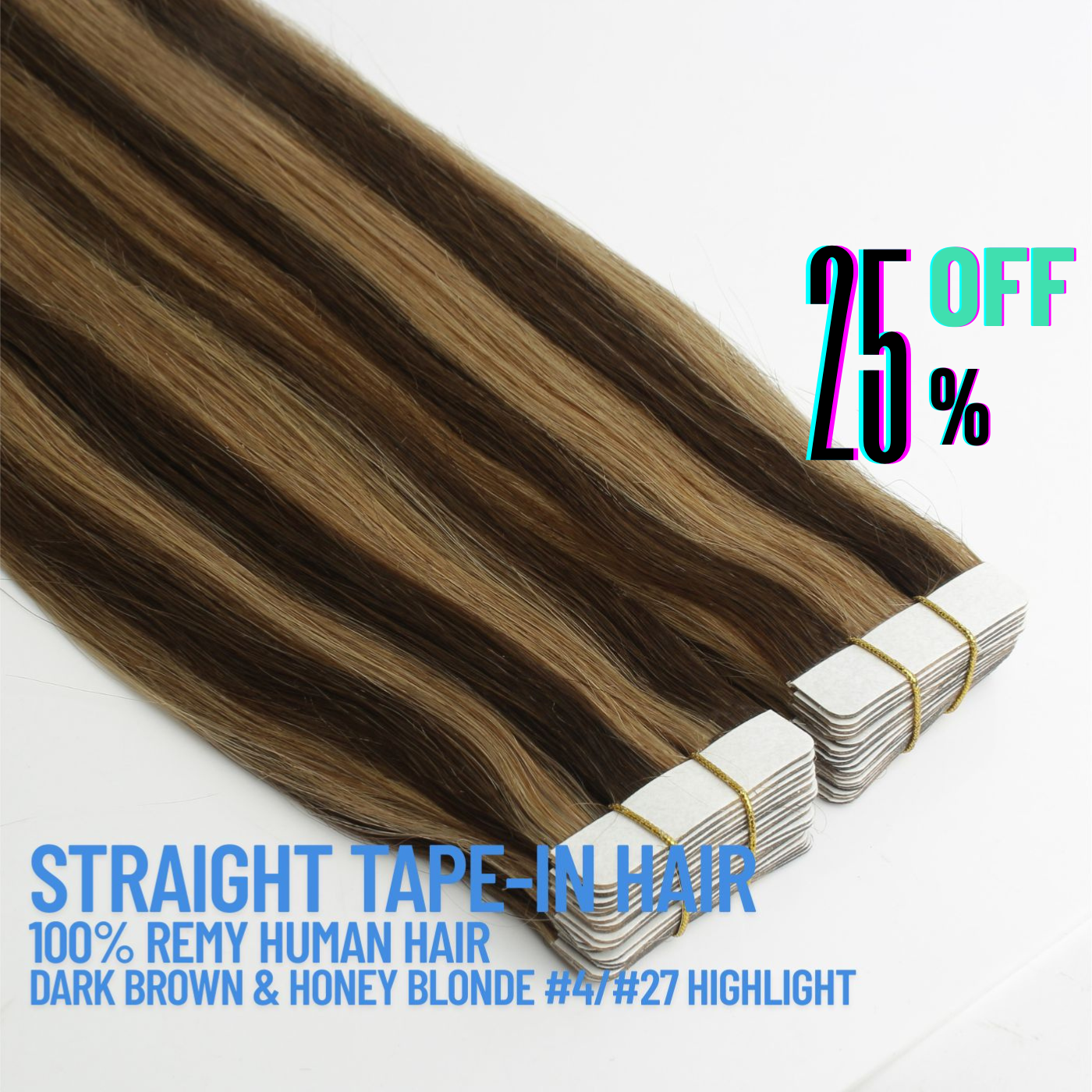 Dark Brown & Honey Blonde #4/#27 Tape-In Hair Extensions – 100% Remy Human Hair, soft, sleek, and easy to install. Our #4/27 Straight Tape-In extensions blend warm dark brown roots with golden honey blonde tips, creating a soft ombré or highlighted effect that adds warmth and dimension.