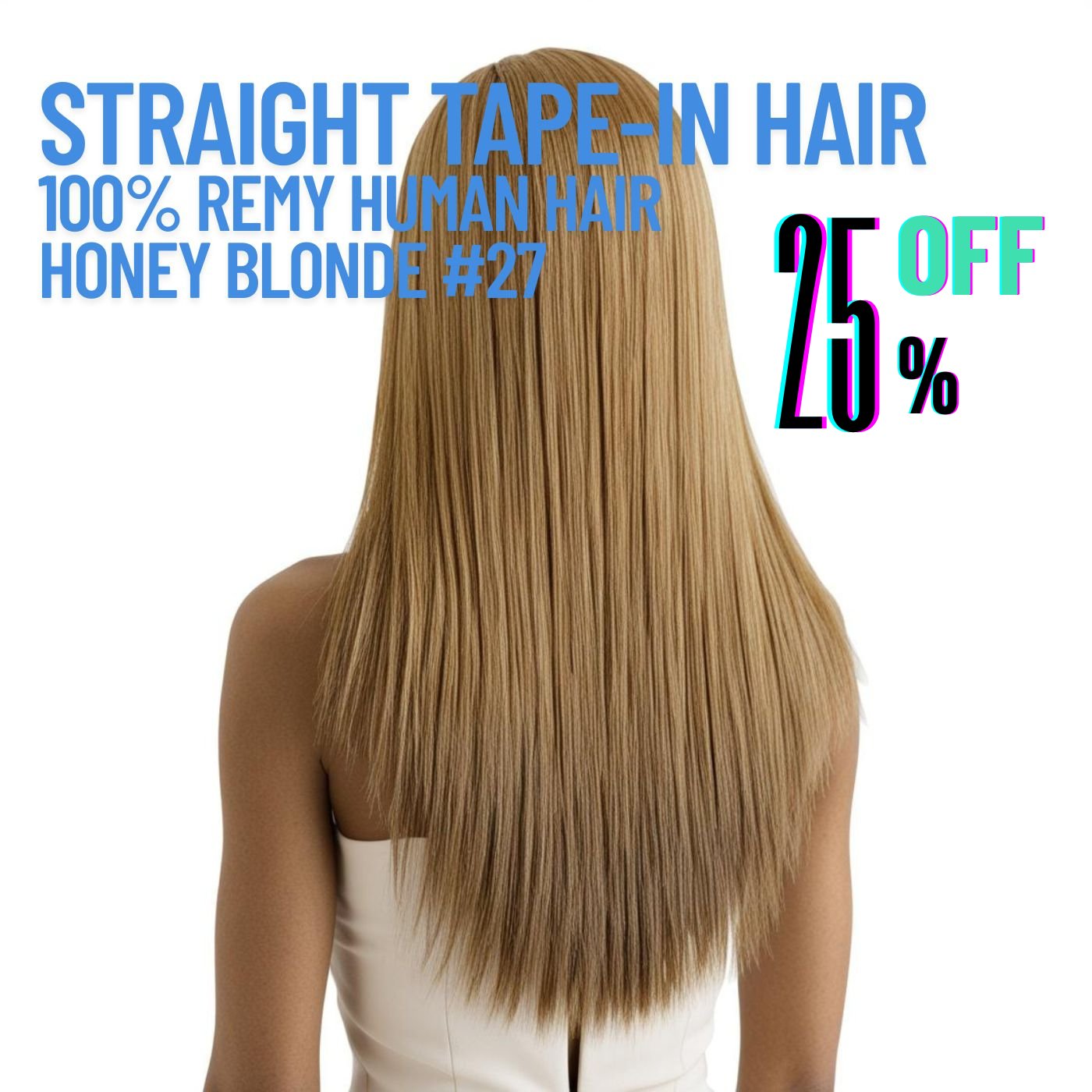 Honey Blonde #27 Tape-In Hair Extensions – 100% Remy Human Hair, soft, sleek, and easy to install. Our #27 Straight Tape-In extensions blend seamlessly with natural hair for a full, voluminous look.