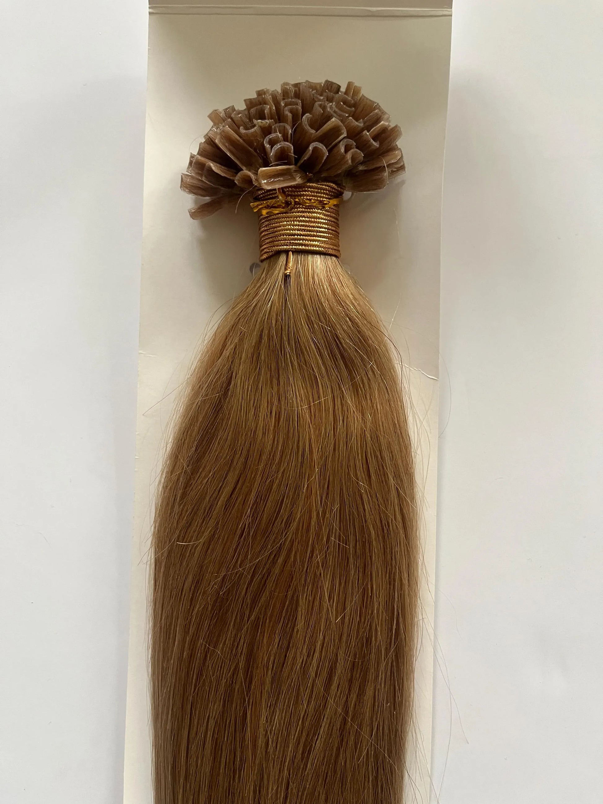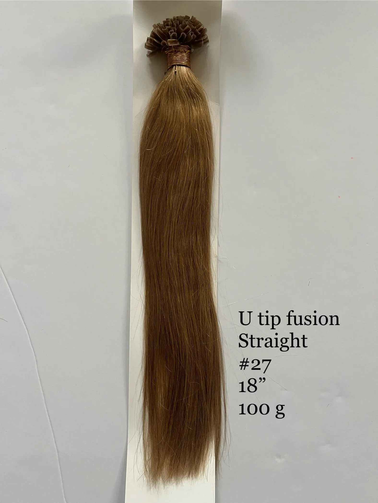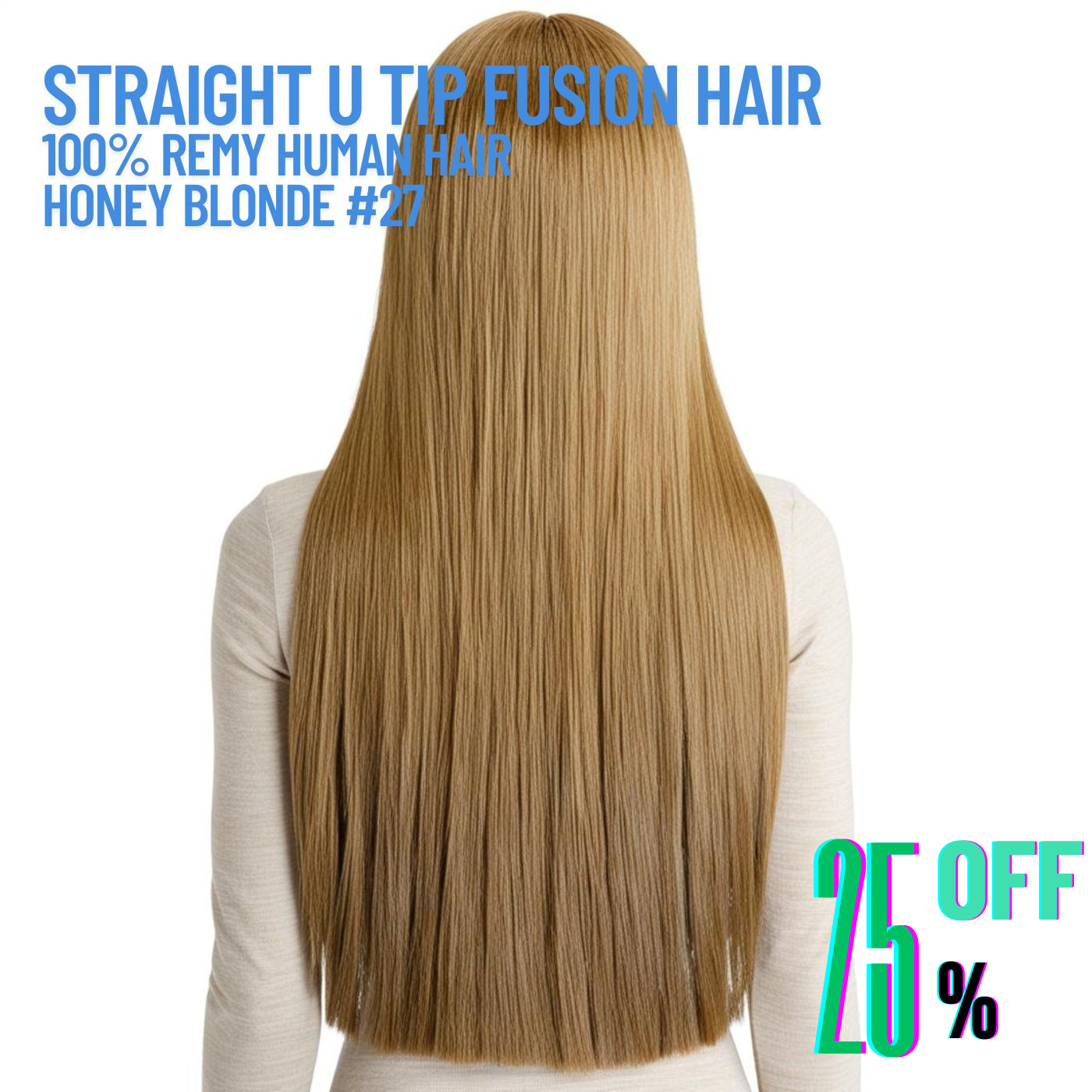 Honey Blonde #27 U Tip Fusion Hair Extensions – 100% Remy Human Hair, soft, sleek, and long-lasting. Our #27 Straight U Tip extensions offer a secure, natural look that's ideal for salon-quality transformations.