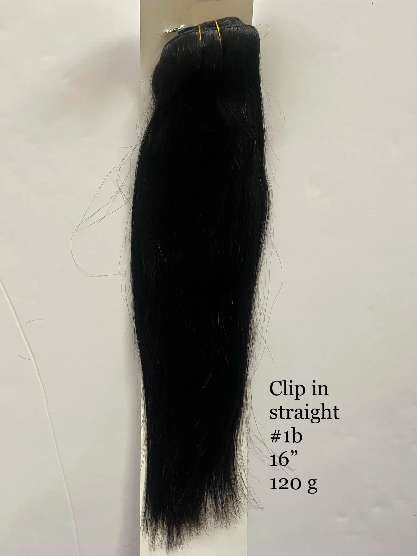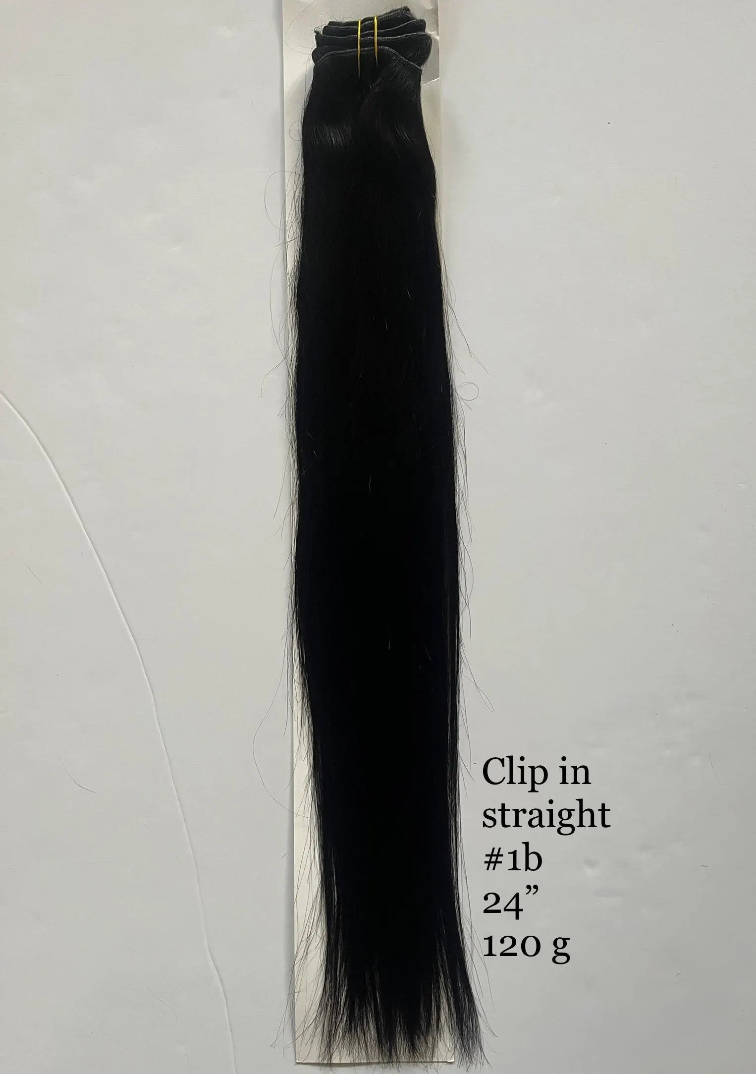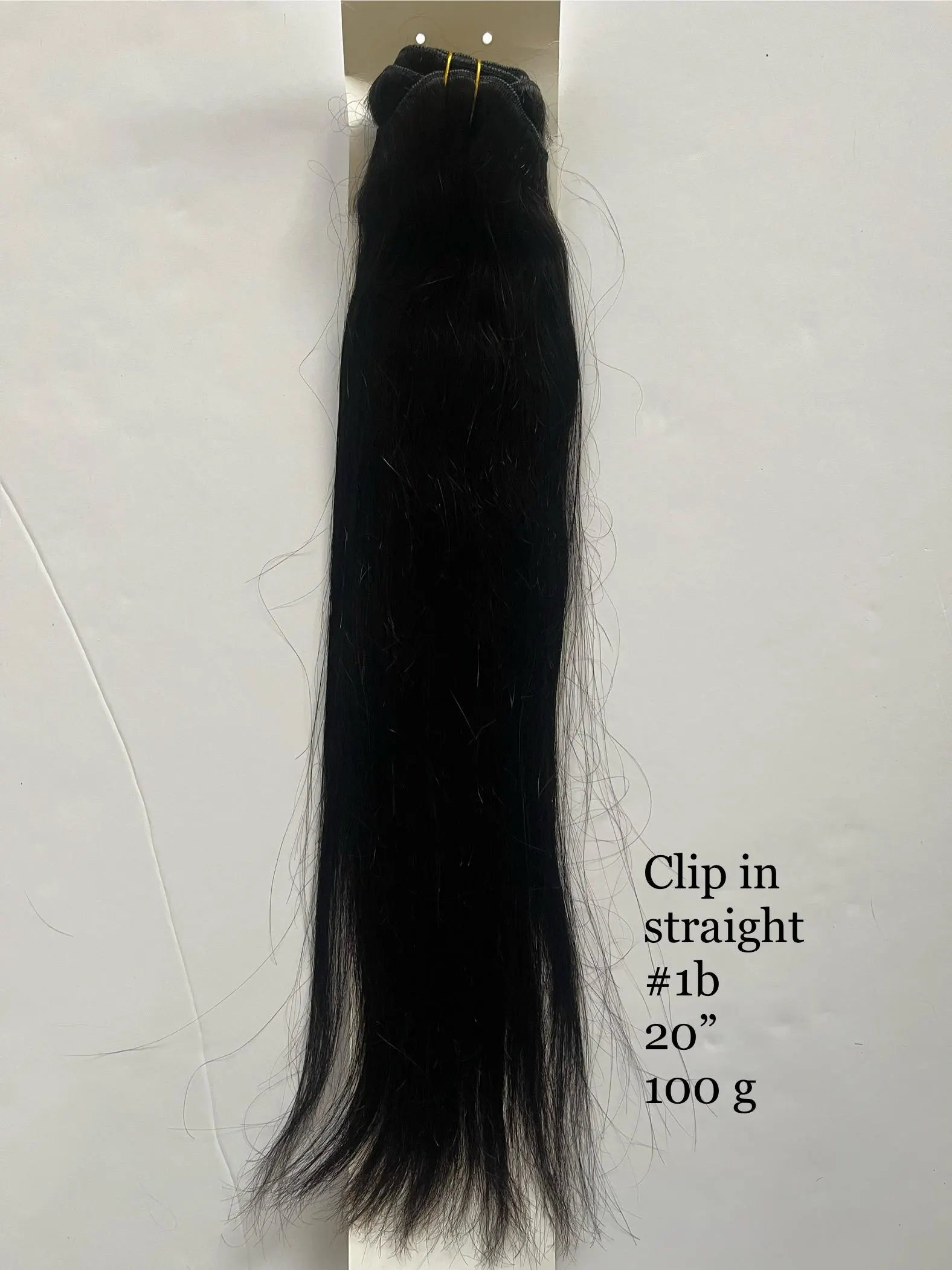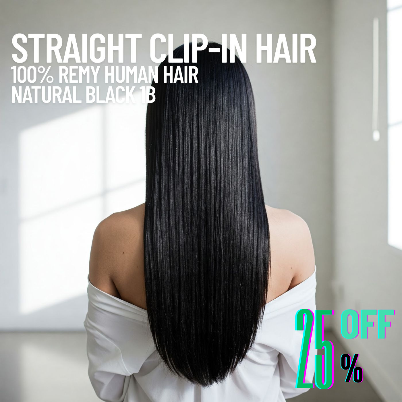 Natural Black #1B Clip-In Hair Extensions – 100% Remy Human Hair, soft, sleek, and easy to wear. Our #1B Straight Clip-Ins offer instant length and volume with no salon needed – just clip in and go!